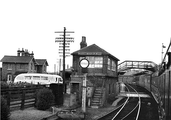 A westbound train is departing from Market Weighton c.1950s. Market Weighton West signal box is seen in the centre. The crossing keeper's house is seen on the left, this is the only railway building still standing at Market Weighton. The engine shed can be seen behind the signal box. 61068 is a Thompson B1 built in 1946 by the North British Loco Co. Glasgow. Withdrawn on 17.6.1963 from Ardsley shed (37A), it was cut up at Darlington Works in July of the same year.