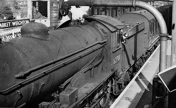 Market Weighton station c.1950s. 62701 is an ex-LNER D49, Shire class designed by Gresley. Completed on 26.11.1927 by Darlington works, it was named Derbyshire, one of 34 locos named after English and Scottish Counties. Withdrawn on 24.9.59 from 53A, Hull Dairycoates shed, it was cut up at Darlington works in October of the same year.
