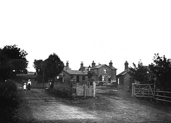 Masham station entrance early 20th century. When the siding was later extended across the road it would pass through the point where the two people are walking.