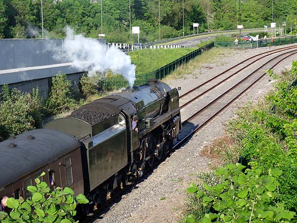 Britannia class locomotive number 70013 'Oliver Cromwell' heads south away from the closed Matlock Riverside station on the return leg of the 'Peak Forester' rail tour on 27 May 2012. The rail tour ran from London Kings Cross to Rowsley South and then returned to Kings Cross.
