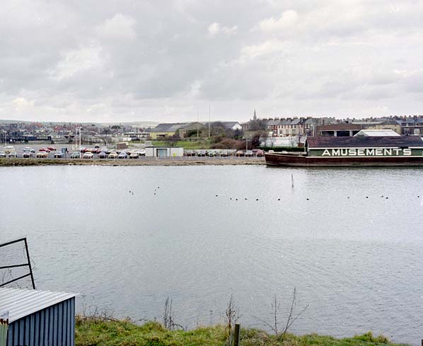 ![]() Looking north at the site of the Backwater viaduct in March 1983. Melcombe Regis station platform can just be made out un the background with the Weymouth goods shed behind it.