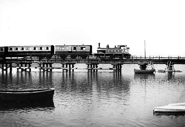 An 02 class crossing the original timber viaduct across the Backwater with a Weymouth train c1900.