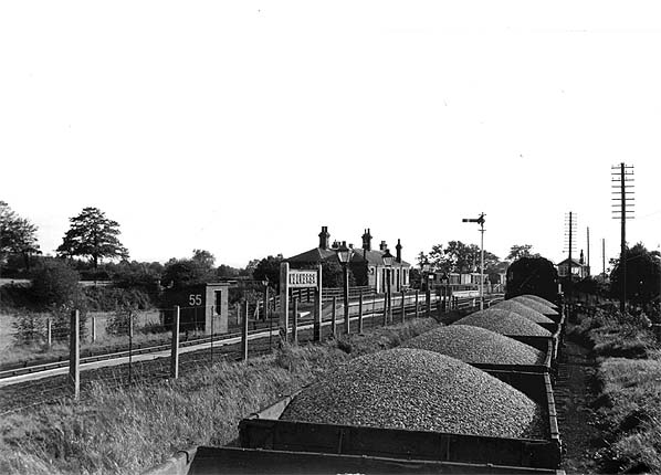 ![]() A mineral train from the Masham branch waits at north junction, Melmerby in 1963. The running in board on the centre is on the resited down platform. The brick hut opposite is roughly in the position of the former Melmerby north signal box.