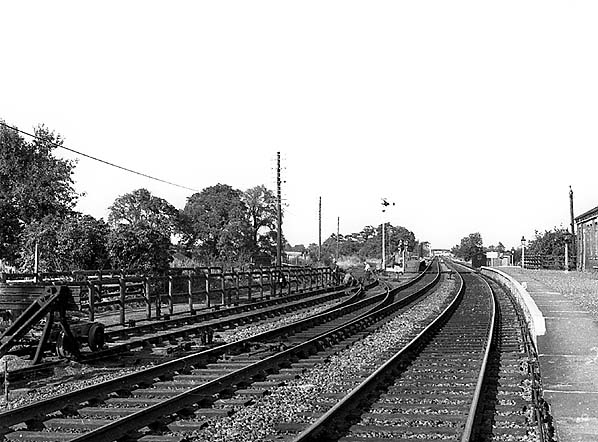 ![]() Melmerby station looking north along the Northallerton line c. mid 1960s. The Masham branch is seen on the left with the resited northbound platform beyond the junction.