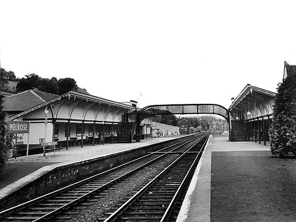 Melrose station looking east along the up platform c.1960s. Note the staggered platforms.