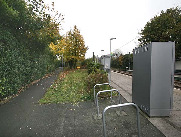 Looking south east towards the junction at Merton Park in November 2008. The Mitcham line platform was at the end of the tram stop while the Tooting line was to the right of the footpath.