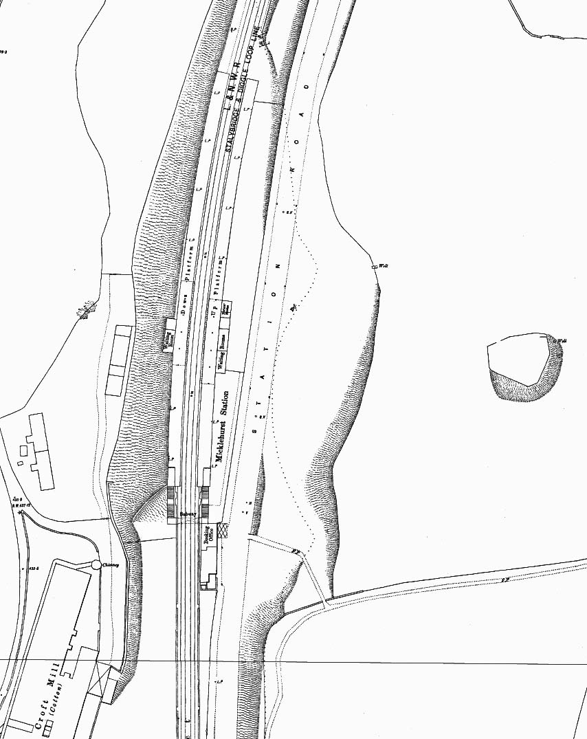 1892 1:500 Town Plan. Mossley was considered important enough to warrant a large scale plan (about 1in to 41ft) and coverage extended to the new station at Micklehurst. On the west side of Station Road the station house (not named) and adjoining booking hall (named ‘Booking Office’) are shown, as is the canopy, shown by cross-hatching above the booking hall door. From the booking hall passengers would reach the foot of the staircase to the up platform or use the subway (named) to reach the staircase to the down platform. Hachures are used, mainly west of the railway, to show that the platforms are on an embankment. Two waiting rooms, a toilet (not named) and a porters’ room are identified in the up platform building, and a single waiting room (with toilet) on the opposite platform. No awnings are shown on these buildings. Since the small canopy is shown on the booking hall at this time it is assumed that the platform roofing had yet to be provided..