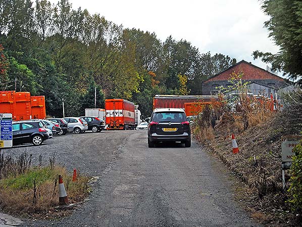 The old goods yard at Micklehurst station, looking south in October 2015. The gable end of the warehouse is visible. The yard is now used by R Plevin & Sons (wood processing and recycling company). The area on the up side of the former goods yard provides parking and manoeuvring space for the many lorries which service the site; the sidings were to the right of the tarmac area and two of them passed through the warehouse.