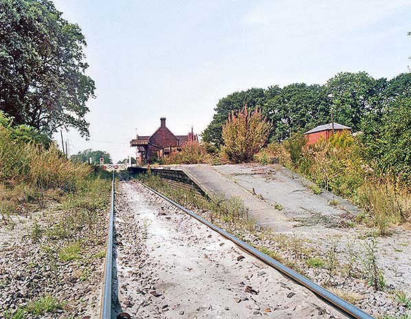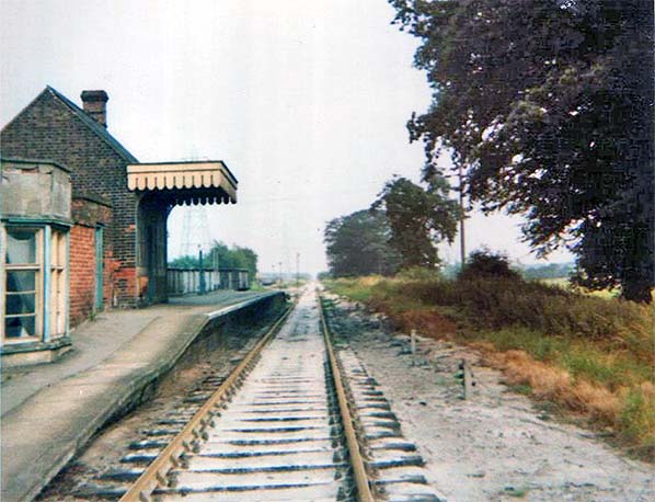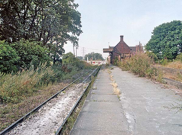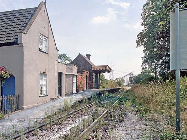 ![]() Looking south-east at Middleton Towers station in August 1990. The stationmaster's house is clearly occupied but the other buildings are disused. Note the step in the platform. The low section is part of the original platform. When the platform was raised a section in front of the booking office door was retained at the original height to avoid having to raise the door.