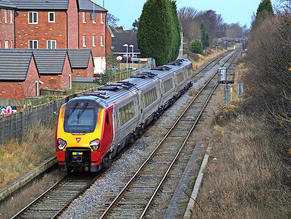 Photo by Paul Wright Looking north-west at Middlewich station on 11 January 2011 as a Virgin Voyager number 221 101 heads north on a diverted Crewe to Chester passenger service. Photo from the wwatfam Flickr photostream Click on thumbnail to enlarge
