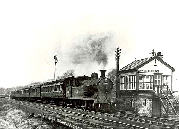 Middlewood High Level signal box seen in the mid 1950s. Middlewood Higher station can be seen in the distance behind the train.