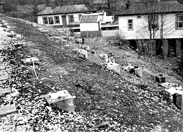 Concrete supports from the Middlewood Higher up platform seen in 1966. Middlewood Lower station can be seen in the background.