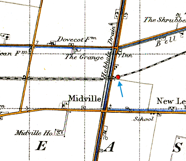 Notes: Midville was another small community barely warranting a station. The station had two timber platforms, each with a brick waiting rooms and canopies on the east side of the Hobhole Bank level crossing. The red brick booking office was sited on the down side of the line adjacent to the crossing with the signalbox and stationmaster's house (smaller than others on the line) on the other side of the line.