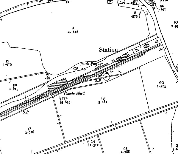 Layout of the goods yard vaguely resembled that at Burwell owing to the presence of a scissors crossing, but there were a number of detail differences. The major difference was the provision at Mildenhall of a 150ft x 40ft goods shed which included a granary and a 1½-ton fixed crane. Track layout comprised a 620ft goods shed road, 610ft goods loop passing along the south side of the shed, 210ft dock road and a 220ft headshunt. The scissors crossing was between the goods shed and station. The dock road was at the usual location behind the passenger platform and also served the three cattle pens which, as at all stations where pens were provided, had a water supply.