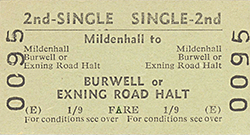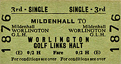 The Railways Act of 1921 saw the GER become part of the London & North Eastern Railway (LNER) on 1 January 1923. On this date Mildenhall Golf Links Halt was renamed Worlington Golf Links Halt. The ‘Halt’ suffix appeared in timetables and on tickets but not on the halt nameboards. As the halts had no proper platforms, the GER introduced carriages fitted with retractable steps. Initial conversions were of increasingly antiquated 6-wheeled stock. Because the halts lacked booking facilities the GER introduced ‘conductor-guard’ working, and for this purpose the carriage stock had to be modified to allow the guard to move through the train. Tickets from Quy were also issued on the train.