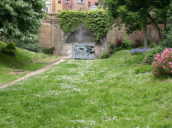 Mill Hill Station in June 1975 - the platform edge is clearly visible. The tunnel is now used by a gun club. Photo by Nick Catford