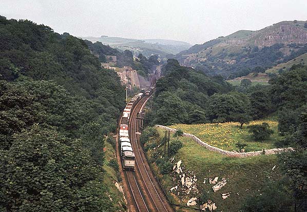 ![]() Seen from above the first of the Chee Tor Tunnels, looking east back towards Miller's Dale station, a mixed goods train headed by an LMS Class 4F 0-6-0 is passing a 'Peak' Class 45 diesel in charge of a Manchester bound express in August 1963. Photo by Geoff Plumb from his Plumb Loco web site