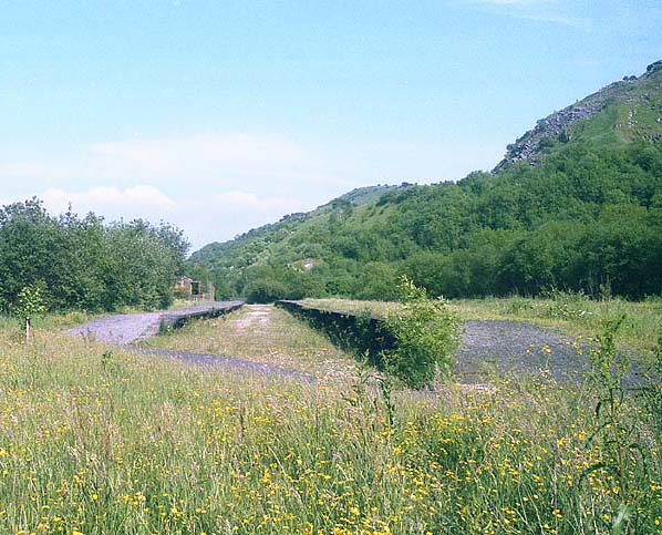 Looking east at Millers Dale Station in June 1989. Three of the stations platform faces had survived. The platform to the left had been an island platform.