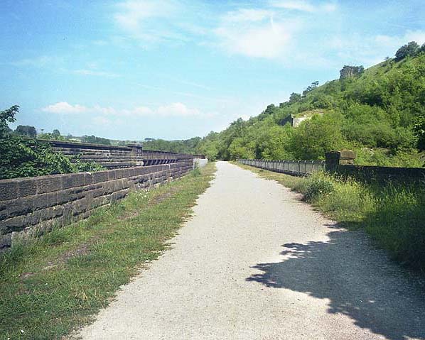 ![]() Looking east from the site of Monsal Dale Station in June 1989. The line crossed the River Wye at this point. The viaduct on which the photographer is standing was built in 1863. Next to it shown on the left of the picture is a parallel viaduct that was brought into use on the 20th of August 1905. It was built to allow extra lines to be laid at Millers Dale. The station was enlarged at the same time. Photo by Nick Catford