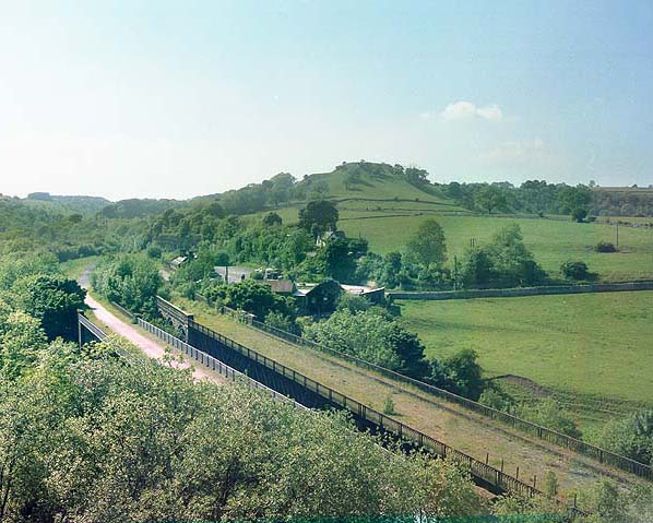 ![]() Looking towards the west at the two viaducts and the station site at Millers Dale in June 1989. The nearest viaduct to the photographer had opened with the line in 1863. The furthest viaduct was constructed between 1903 and 1905. It was brought into use on the 20th of August 1905. At the far end of the newer viaduct the surviving station buildings can be seen. Photo by Nick Catford