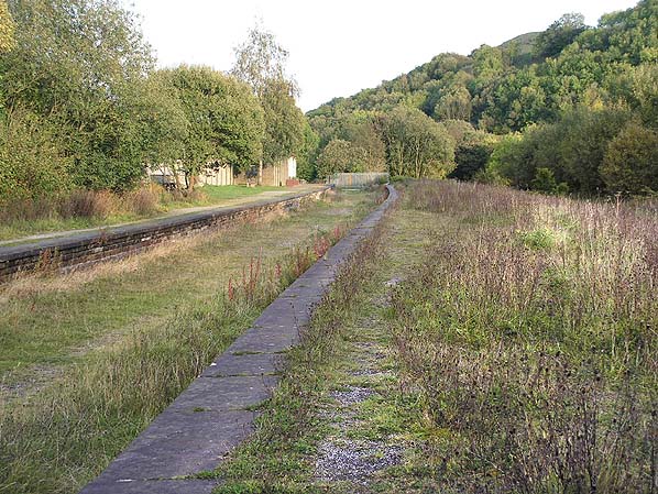 ![]() Millers Dale station looking east in October 2009 from what was the island platform that was numbered 2 and 3. The edging stones of platform 2 can clearly be seen. To the left of the picture is platform 1. Photo by Paul Wright