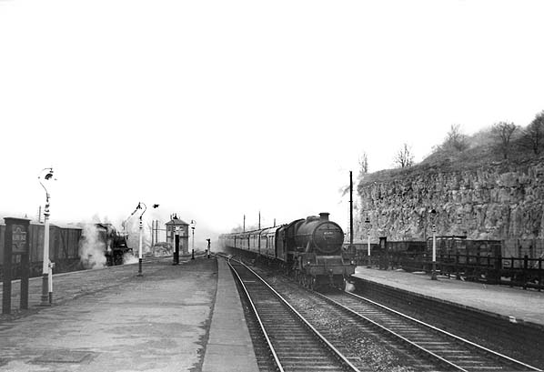![]() A southbound express hauled by 45650 Blake pulls into Millers Dale stations platform 1 in 1957. Passing through platform 4 on the left of the picture is a northbound goods service. The stations goods yard, seen on the right is filled with goods wagons showing just how busy Millers Dale was. Photo by John Oxley/Peak Rail collection