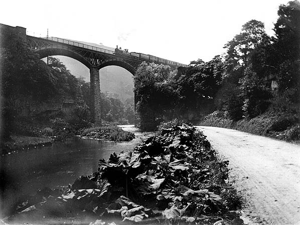 An Up express departs from Millers Dale station and crosses the then single viaduct c.1900.