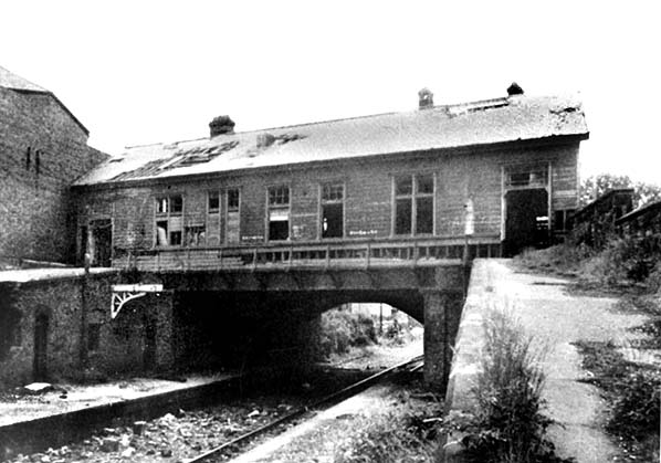 In July 1975 the overtrack building survives at Millfield station, though in a decrepit condition, and both platforms are extant. Only one railway track remains in place, and it would carry freight traffic until 1984. This view is south-eastward from the ramp from the up (Sunderland-bound) platform.
