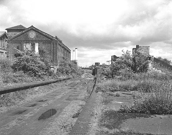![]() The line into the Poplar Dock that crosses over Millwall Junction Station which is behind the building on the right. (April 1981). The remains of the footbridge from Harrow Lane can be