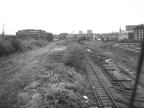 ![]() Looking west from Millwall Junction Station in April 1981