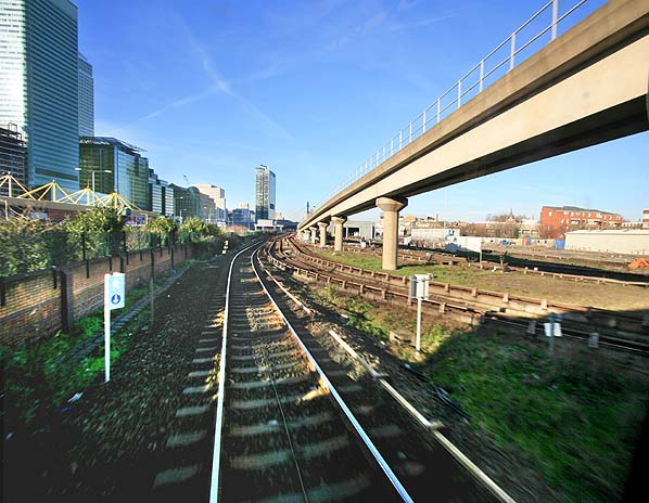 ![]() Looking from Harrow Lane along the line of the station access footbridge to the site of Millwall Junction Station which was sited where the railway viaduct now stands. (February 2008). Photo