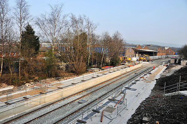 ![]() Milnrow station looking south during construction of a Metrolink tram stop in March 2012.
