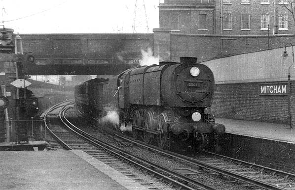 Q1 33017 hauls an electric set through Mitcham Station in the 1950's