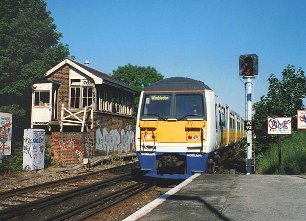 Wimbledon train arriving at Mitcham Junction Station in May 1997
