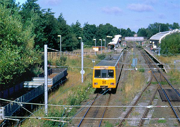 [Source: Alan Young] ![]() Monkseaton seen from the footbridge to the south-east of the station. On 15 August 1998 a Metro train is heading away from the camera towards the up platform. A siding is retained in the left foreground for engineering maintenance purposes.