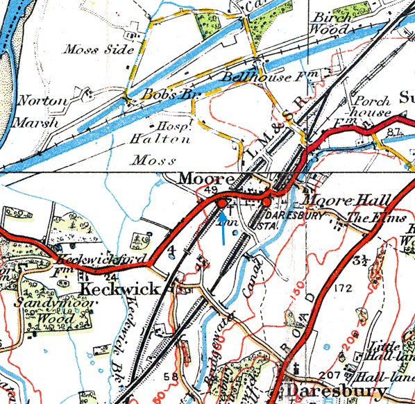 Moore station opened with the line on 4 July 1837. It was located on the south side of Runcorn Road on the western edge of its namesake village. The double-track line passed under Runcorn Road and the station was located in a cutting. At the time of opening access was via a path down to track level on the west side of the line. At that time there would not have been raised platforms and only a simple cottage-like building which would have housed the booking facilities.