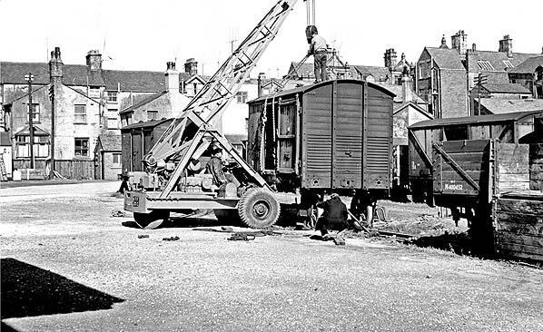 ![]() ![]() [Source: Nick Catford & Paul Wright] ![]() The Morecambe Euston Road goods yard in September 1961. A condemned box van is being lifted from its wheels having been purchased by local company W J Cross, builders' merchant who occupied part of the yard. Photo by Ron Herbert