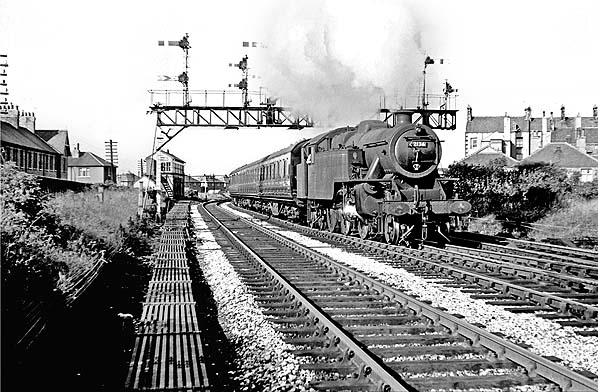 ![]() ![]() [Source: Nick Catford & Paul Wright] ![]() The 9.55am Class B stopping passenger service from Morecambe Promenade to Lancaster Castle is seen passing Morecambe Euston Road and approaching Lancaster Road overbridge in September 1961. Euston Road signal box is seen on the left. 42136 is a Fairburn-designed 4P 2-6-4 passenger tank. Built at Derby works and entering service on 9 February 1950, this loco had a service life of less than 13 years when it was withdrawn from Lancaster Green Ayre on 12 January 1963 and broken up two months later. This class was introduced in 1945, a development by Fairburn of the Stanier 2-6-4 design with a shorter wheelbase as well as minor detail changes. Photo by Ron Herbert
