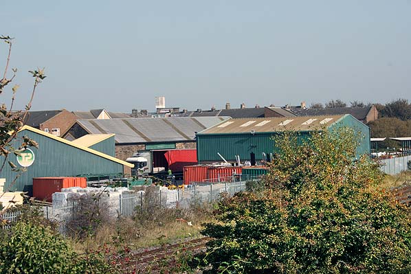 Morecambe Euston Road goods yard in September 2011. The former goods shed is still used by builders' merchant Travis Perkins. It has been re-roofed and is seen in the centre.