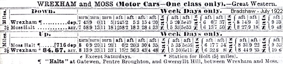 The July 1922 Bradshaw showed ten weekday trains from Moss Halt for Wrexham General. On Saturdays there were thirteen departures to Wrexham. There was no Sunday service.