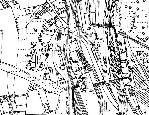 Moss had a single wooden platform on the west side of the line on which stood a corrugated iron waiting shelter, a small wooden shed and at the north end a signal box which controlled the level crossing. Directly to the east of the halt was the Westminster Colliery which had its first shafts sunk in the mid nineteenth century. It had extensive sidings which branched off |