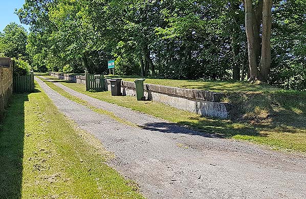Looking south-west at Moulton Station in June 2018. The track between the platforms is a private drive.