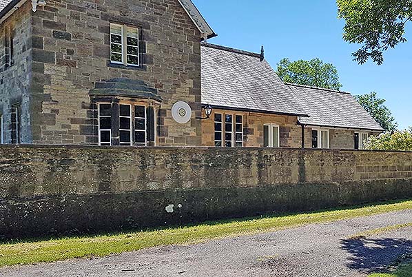 The station building and stationmaster's house on the down platform at Moulton Station in June 2018. The station clock has been restored.
