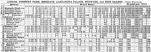 In 1911 the Muswell Hill & Palace Railway was purchased by the GNR, and although passenger numbers had improved this was halted by competition from the new, more convenient, tram services. Through trains to central London outside the rush hour were withdrawn during WW1 when a weekday shuttle between Finsbury Park and Alexandra Palace was introduced. Although the full weekday service was restored at the end of the war the branch never fully recovered and passenger numbers at all stations between Highgate and Alexandra Palace markedly declined.