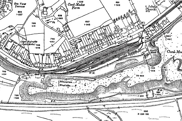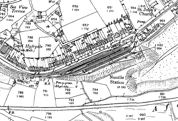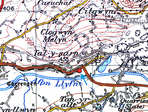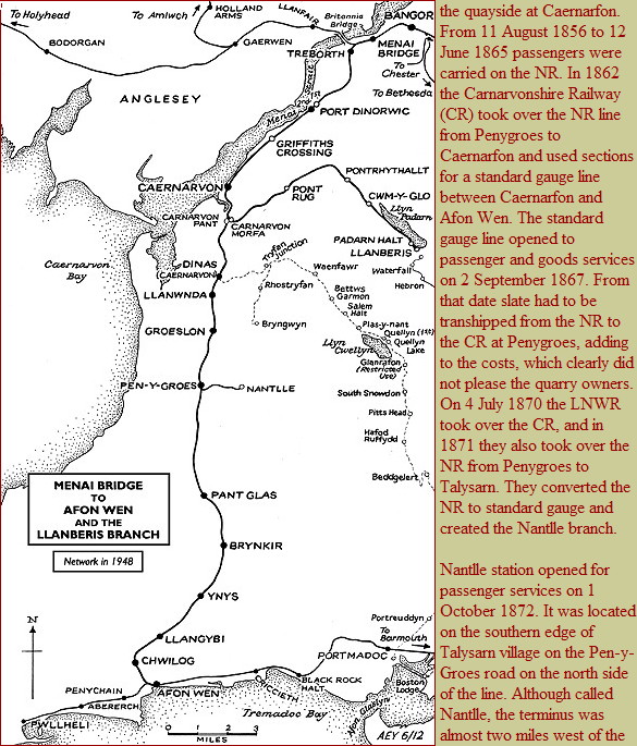 Notes: Nantlle station was located in the village of Talysarn and was the eastern terminus of the London & North Western Railway (LNWR) branch that connected with the Menai Bridge – Afon Wen line just under 1½-miles west at Penygroes. The branch opened to goods services on 1 August 1872, but a railway between Nantlle and Caernarfon had existed since 1828. It was a 3ft 6in horse-drawn tramway - the Nantlle Railway (NR) - to move slate from quarries at Nantlle to