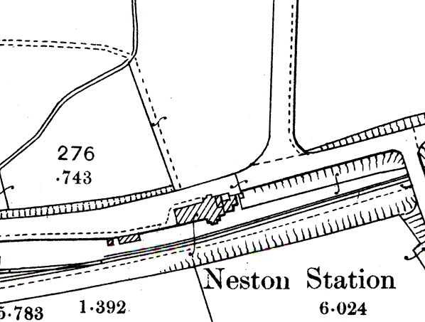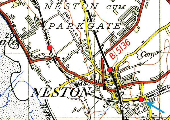 On 1 July 1950 the goods facilities at Neston station were renamed Neston South. This was to distinguish them from the former GCR station which had also become part of BR[LMR]. The former GCR station facilities became Neston North. On 15 September 1952 the passenger station was also renamed as Neston South.