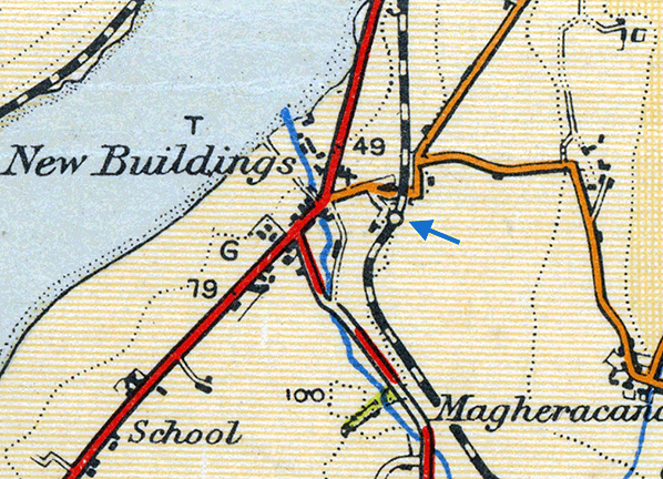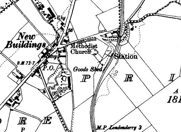 Notes: New Buildings was one of the intermediate stations on the Donegal Railway’s single track (DR) Strabane – Londonderry Victoria Road line which opened to goods on 1 August 1900 and to passengers on 6 August 1900. The 14½ mile line was of the 3ft gauge and it had been built to provide the DR with direct access to the city of Derry/Londonderry (from 1894 until the line opened the DR had to tranship goods onto the 5ft 3inch gauge Great Northern Railway Ireland [GNRI] route to Londonderry Foyle Road).