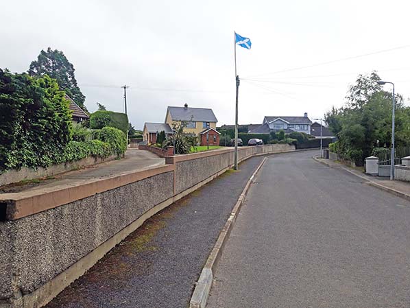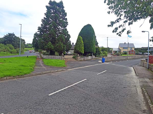 ![]() A view looking south-east along the course of the New Buildings station approach road on 29 August 2020. The station building had been located where the house can be seen to the left of the telegraph pole with the flag. The modern residential road follows the same course as the station approach road at this point but was extended beyond the site of the station when the houses were built.