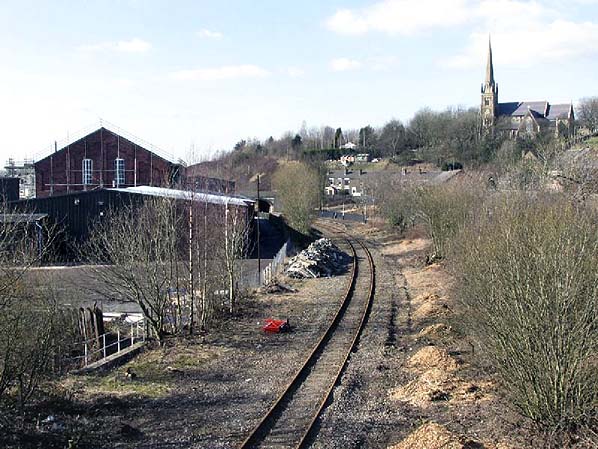 ![]() Looking north west towards New Hey station from Two Bridges Road bridge in March 2010. The L & Y cotton warehouse is seen on the left. Photo by Alan Perryman