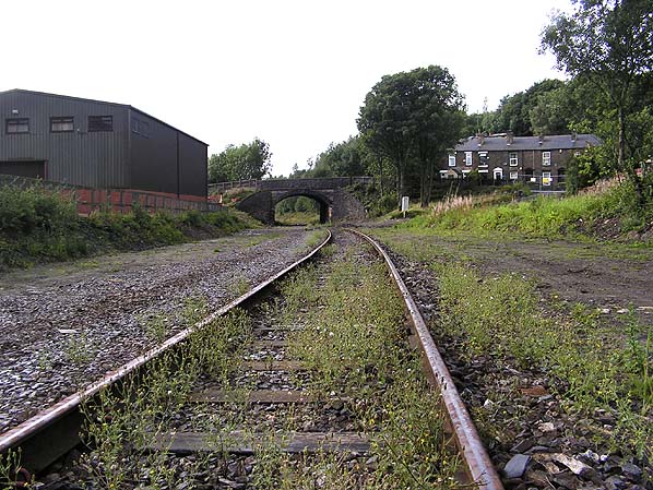 ![]() Looking west at the site of New Hey Station in late August 2010. By this date the stations platforms had been demolished. There was evidence that rail vehicles had recently been using the single track line. In all likelyhood this would have been contractors plant items fitted with flanged wheels for travelling along railway lines. Photo by Paul Wright
